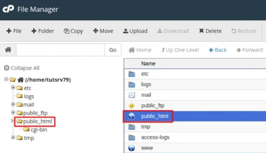 Now log into your cPanel and look for the “public_html” folder to access the root directory of the website. Once this is open, drag your file into it.