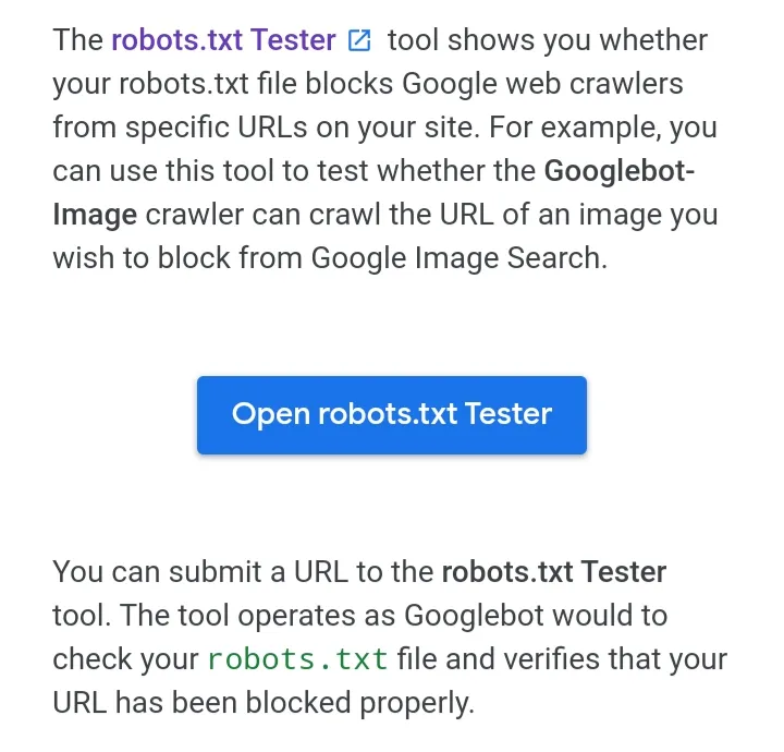 First you will have to visit the Google Support page, where you will get an overview of the functions of the Robots.txt test function. You will also find the test tool there: