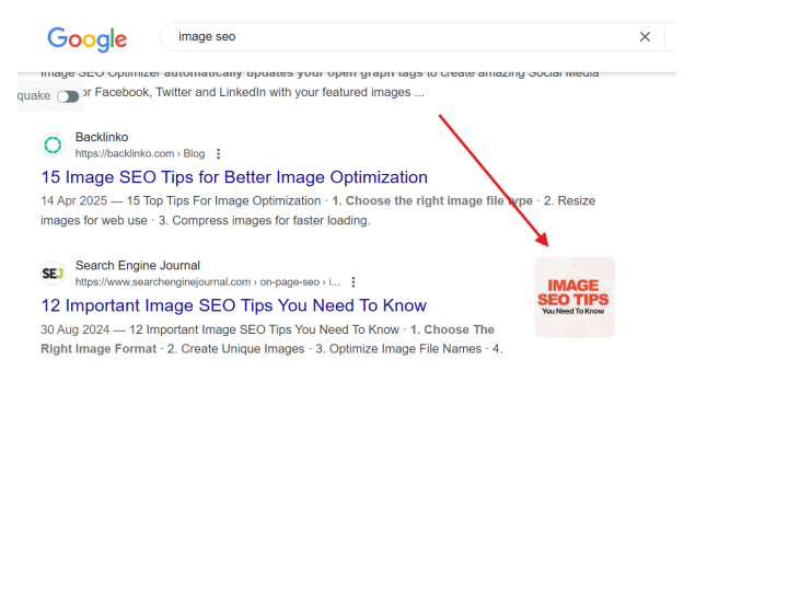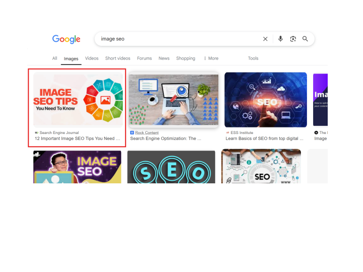 For instance, search "image SEO," and you'll see how "SEJ" secures the top spot in Google Images: